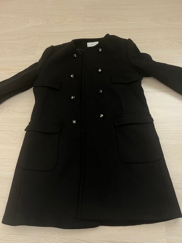 Uzun kollu, dekoratif düğmeli siyah kaban, kullanışlı çoklu ceplerle donatılmış.