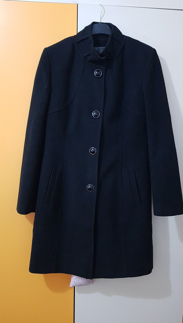Düğmeli, dik yaka, yan cepli siyah kaban, klasik ve şık bir görünüme sahiptir.