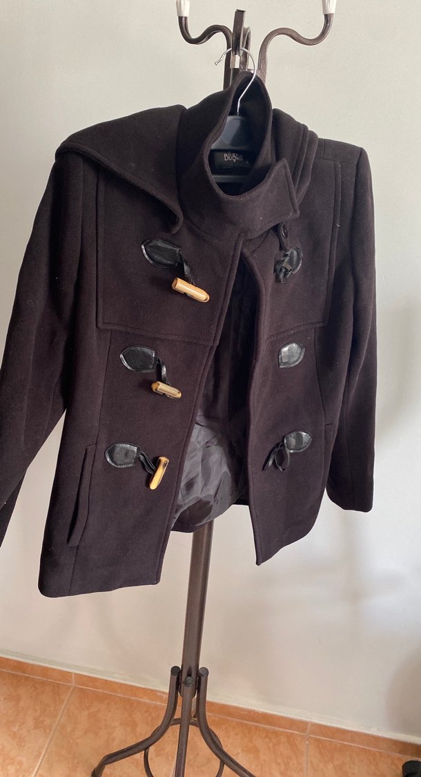 Düğmeli ve yüksek yakalı siyah kaban, sıcak tutan kumaştan üretilmiştir. İki yan cepli klasik tasarıma sahiptir.