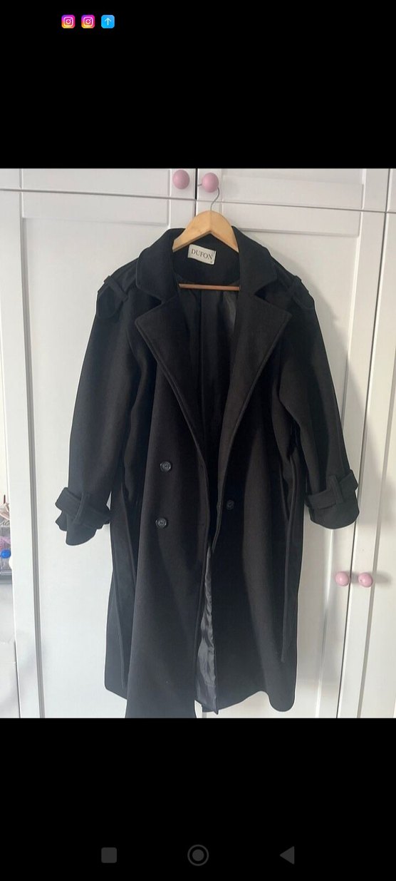 Çift düğmeli siyah kaban, klasik yaka ve uzun kollu, yumuşak iç astarlı.