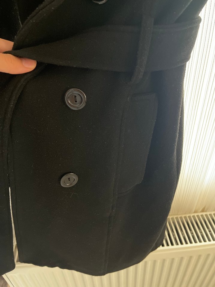 Düğmeli ve yan cepli siyah kaban, yumuşak ve sıcak kumaştan üretilmiştir.