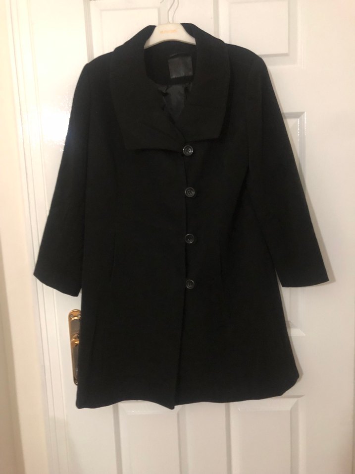 Uzun kollu, düğmeli siyah kaban, geniş yakasıyla klasik bir görünüme sahiptir. Az kullanıldı tüğlenmesi yok . Uzunluk 91 İki kol arası 56