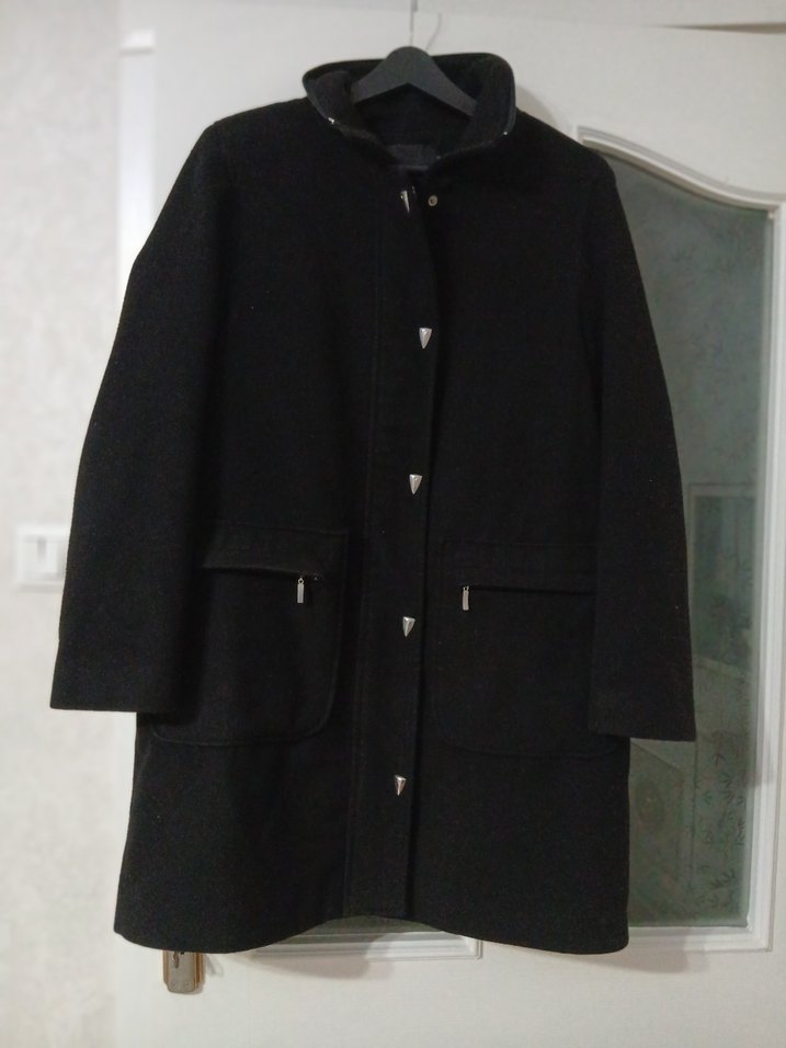 Düğmeli, siyah midi hamile kaban, yakalı ve uzun kollu, minimalist tarz günlük kullanım için uygun. #kaşekaban