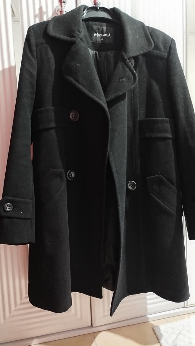 Düğmeli ve cepli, klasik yakalı siyah kaban, uzun kollu ve sıcak tutar. sorunu yoktur