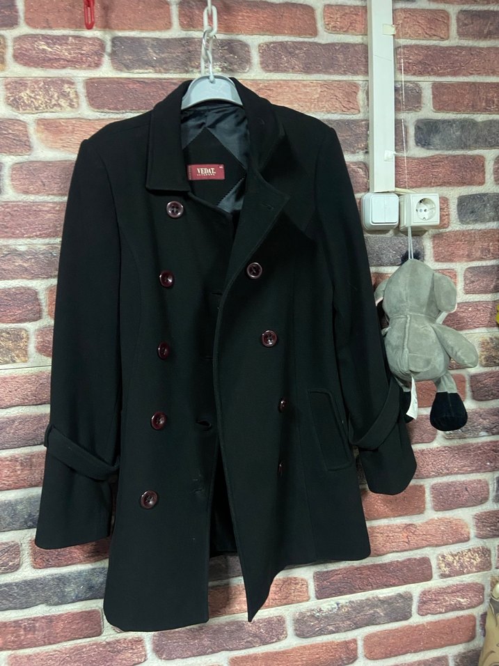 Düğmeli detaylı, klasik yakalı siyah kaban, iç kısmı düzgün astarlıdır ve rahatlık sağlar.