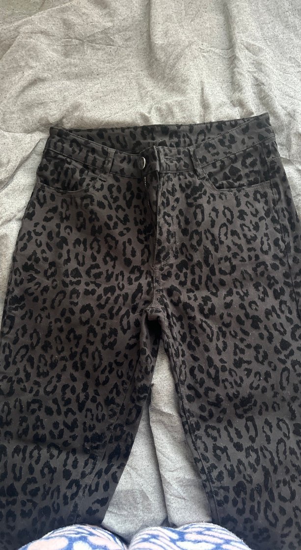 Düğmeli, gri kumaştan yapılmış, hafif leopar desenli, fitted kesim kadın pantolon. Rahat ve şık, midi boy outdoor kullanıma uygun.