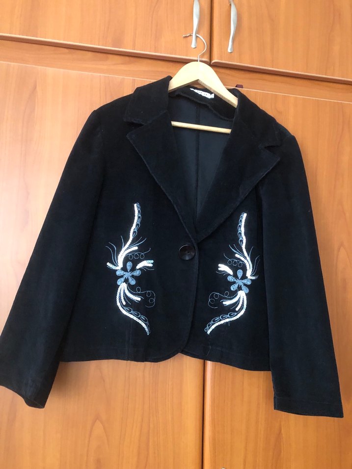 Siyah kadife kumaştan yapılmış, nakışlı, düğmeli, kısa boy, uzun kollu kadın blazer. Ofis için uygun, gotik ve bohem tarzda.akra marka