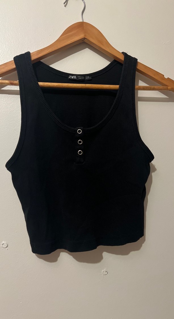 Pamuk kumaştan yapılmış, düğmeli ve yuvarlak yakalı siyah kadın atlet. Minimalist ve günlük kullanıma uygun, vücuda oturan kesime sahiptir.