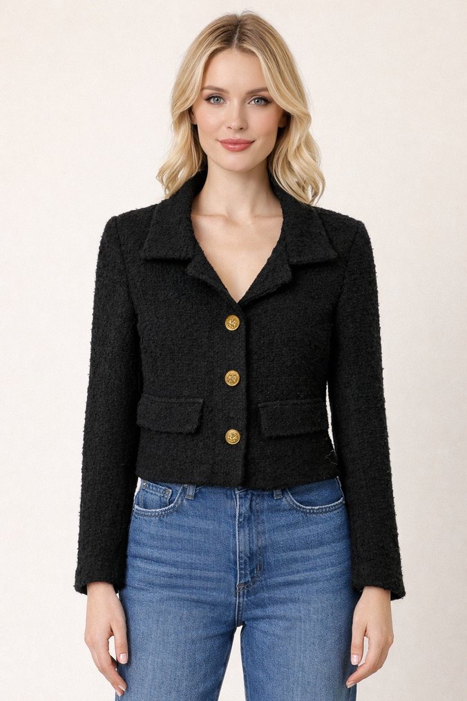 Siyah renkli, düğmeli, uzun kollu kadın blazer tuvit kumaş, normal boyda ve regular fit kesime sahip. Ofis kullanımı için uygundur.