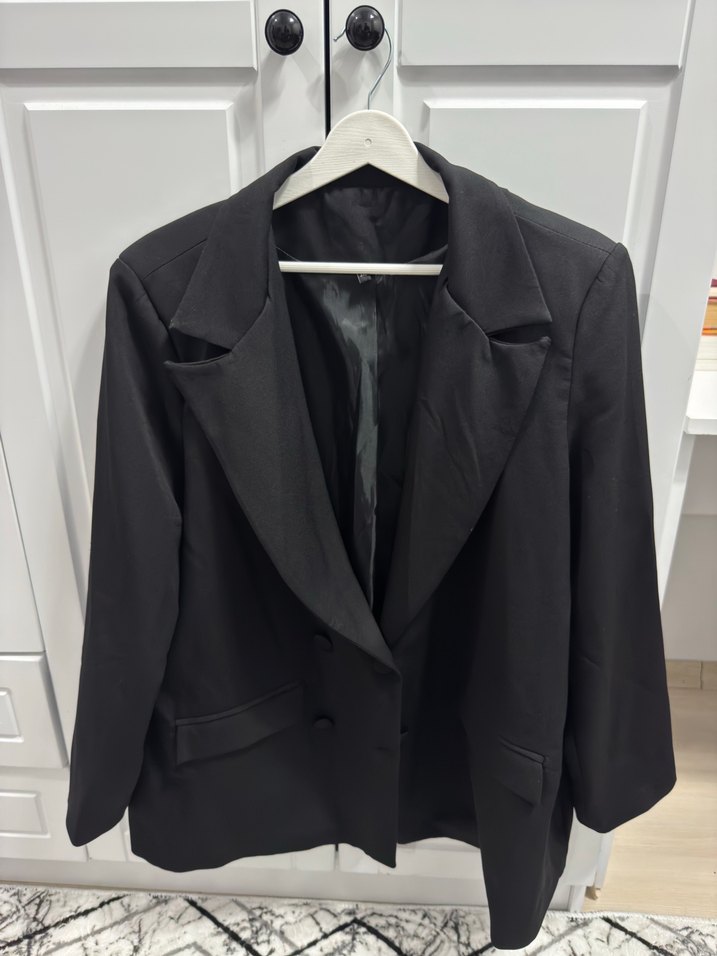 Düğmeli ön kısmı ve keskin yakasıyla, uzun kollu, ipeksi dokulu siyah kadın blazer ceket. Ofis için uygun, normal kesim ve midi boy. İçi astarlı çok şık ve tok duruyor. 110 kiloya kadar olur.