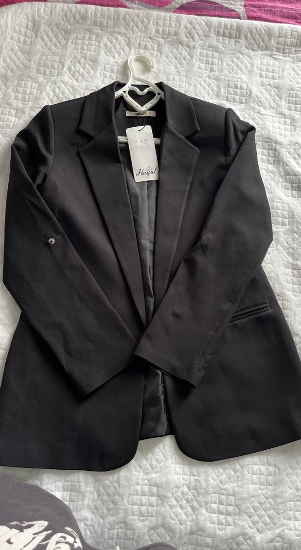 Düğmeli, yakalı ve uzun kollu siyah kadın blazer. Normal boy ve rahat kesim, ofis için uygun ipeksi kumaştan yapılmıştır. Hiç kullanılmamıştır