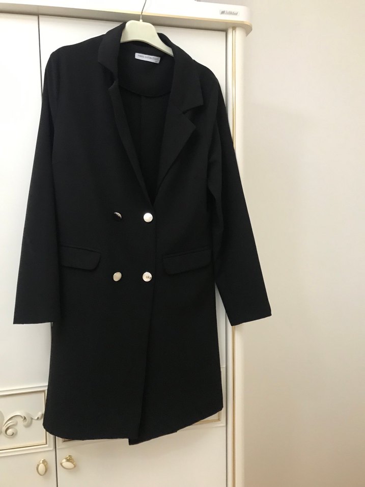 Düğmeli, uzun siyah kadın blazer ceket, klasik yaka ve uzun kollu. Yumuşak ve sıcak kumaştan, ofis için uygun. Kolunda ütü izi vardır ıkı koltuk arası 50 88 cm boy