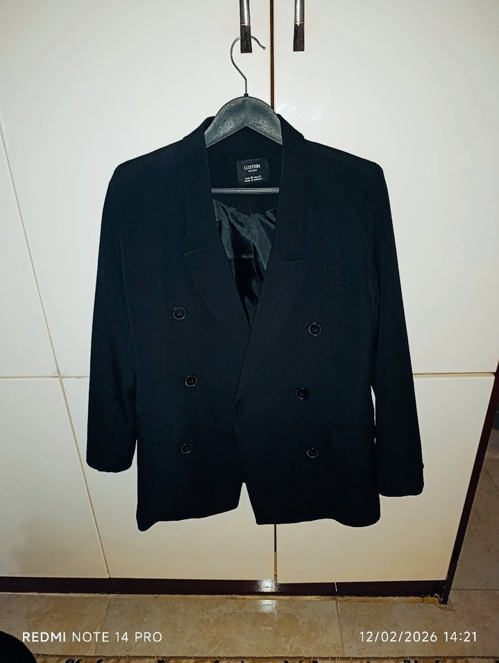 Düğmeli, uzun kollu siyah kadın blazer ceket, normal boyda ve rahat kesimdir. Yumuşak ve sıcak kumaştan üretilmiştir, iş ve günlük kullanıma uygundur.