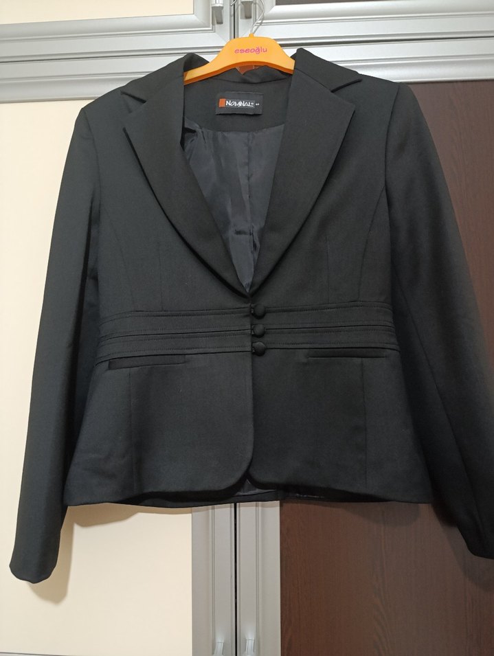 Düğmeli, normal uzunlukta siyah kadın blazer ceket, notched yaka ve uzun kolludur.boy.56 cm göğüs.43 cm kusuru yoktur