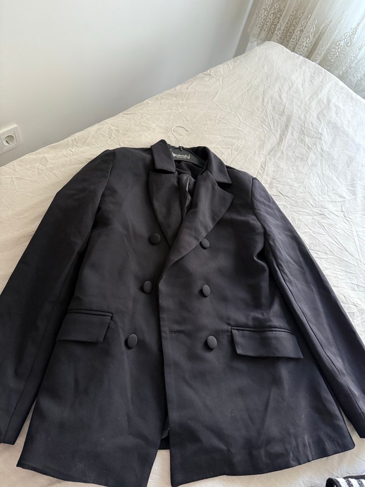 Siyah kadın blazer ceket, düğmeli ve kesik yakalıdır. Regular fit, uzun kollu ve midi boydadır. Sentetik kumaştan üretilmiş, klasik şıklık sunar.
