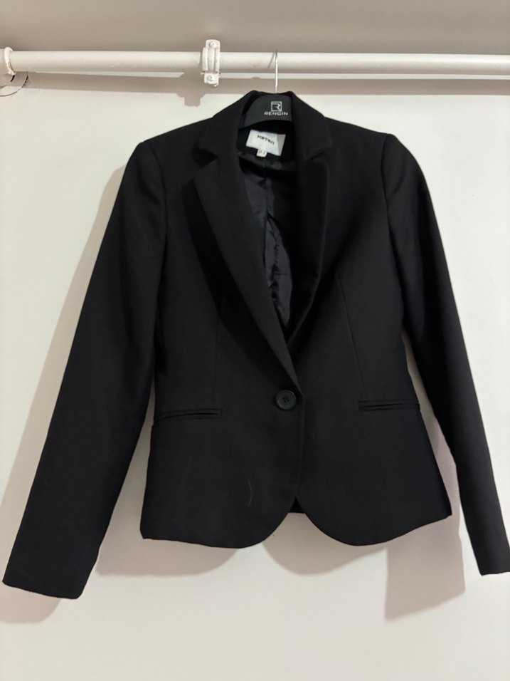 Düğmeli, notched lapel yakalı siyah kadın blazer ceket. Uzun kollu, midi boy ve rahat kesim. İş hayatı için klasik ve şık bir tercih.