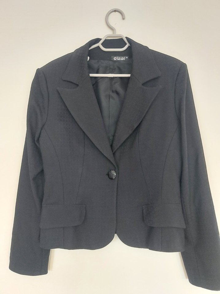 Düğmeli, siyah kadın blazer ceket, keskin yaka ve normal kesime sahiptir. Uzun kollu ve midi boyda, ofis için uygundur.