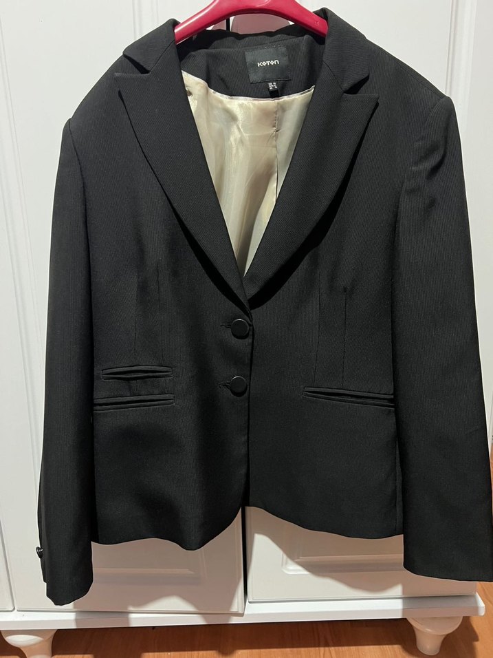 Düğmeli, ipek dokulu kumaştan yapılmış, normal kesim ve uzun kollu siyah kadın blazer ceket. İş ortamına uygun klasik tasarım.