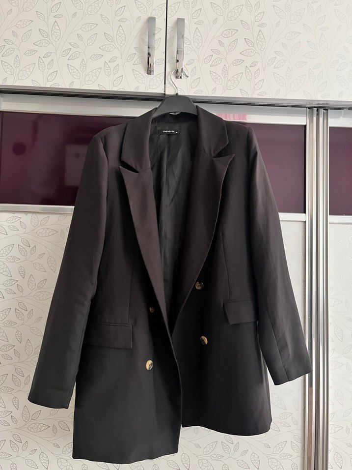 Düğmeli ön kısmı ve keskin yaka detayına sahip siyah kadın blazer ceket. Normal kesim, uzun kollu ve midi boyda, ofis için uygun şık tasarım. Sentetik kumaştan üretilmiştir.