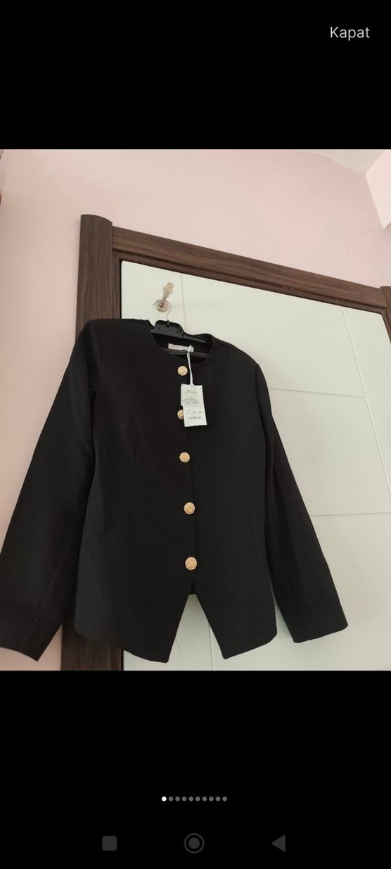 Düğmeli ön cepheli, kesik yaka detaylı siyah kadın blazer. Uzun kollu, normal kesim ve midi boyda. Sentetik kumaştan, iş ve günlük kullanım için uygun.