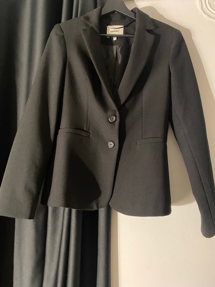 Düğmeli, koyu siyah renkte kadın blazer ceket. Notch yaka, uzun kollu ve normal uzunlukta, sentetik kumaştan üretilmiştir. İş ortamları için uygundur.