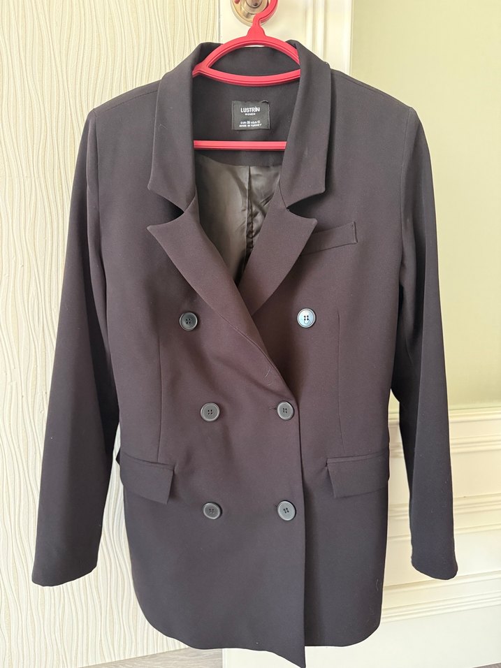 Düğmeli önden kapamalı, siyah kadın blazer ceket. Normal uzunlukta, uzun kollu ve düz kumaştan üretilmiştir. Ofis için uygun, rahat kesim ve şık tasarıma sahiptir. Işıktan dolayı rengi böyle çıkmış siyah renk sıfır ayarında