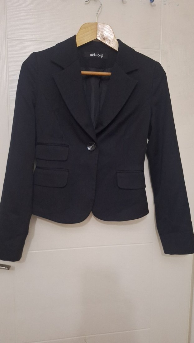Siyah, düğmeli, kruvaze yaka kadın blazer ceket. Normal boy ve regular fit, uzun kollu, ofis kullanımı için uygun.saten pamuklu karışım kumaş yumuşaktır