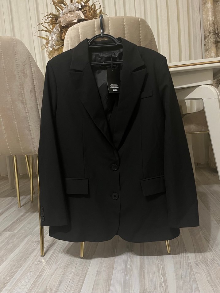 Siyah renkli, düğmeli ve yaka detaylı kadın blazer ceket. Normal midi boyda, düz kesim ve sentetik kumaştan üretilmiştir. Ofis için modern klasik tarzda.