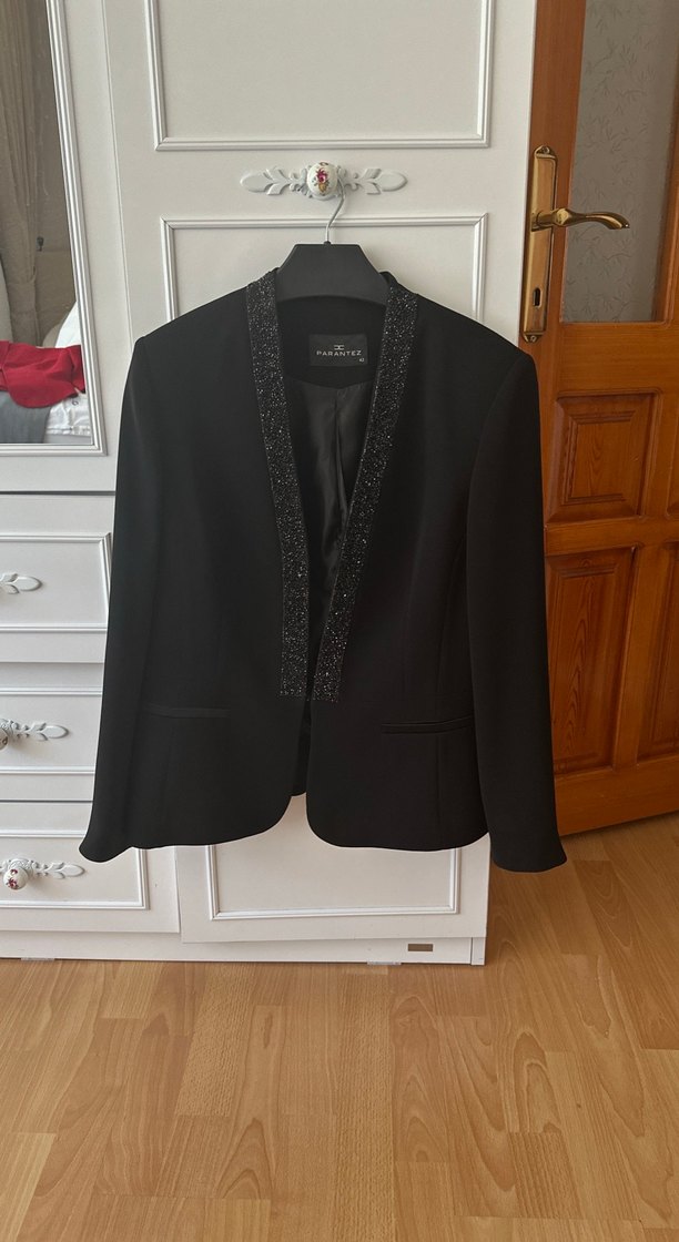 Düğmeli, işlemeli detaylı siyah kadın blazer ceket. Uzun kollu, regular fit ve ipeksi dokulu, ofis için uygun klasik goth tarzı.