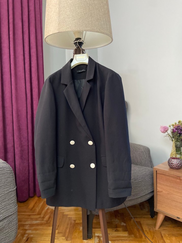 Düğmeli ve uzun kollu siyah kadın blazer ceket, normal boy ve regular fit. Sentetik kumaştan üretilmiş, ofis kullanımı için uygundur.