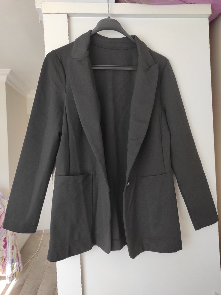 Siyah, düğmeli, uzun kollu kadın blazer ceket. Normal boyda, regular fit, ofis için uygun. Yumuşak kumaştan üretilmiştir. bir kez giyildi H&M. S-M bedene uyar