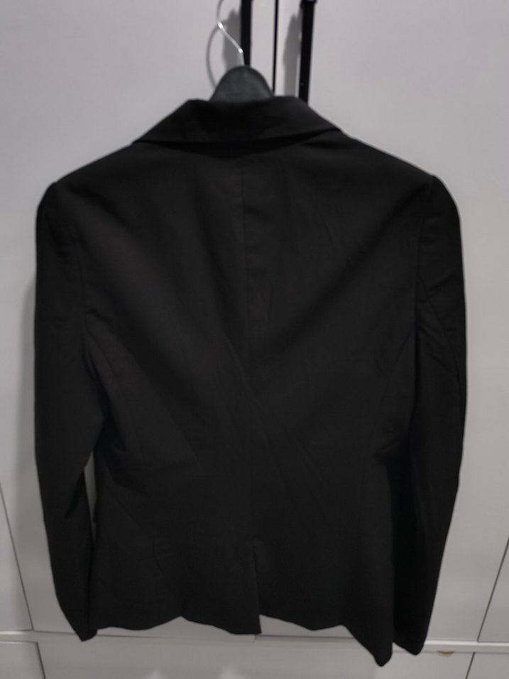 Düğmeli siyah kadın blazer ceket, kesik yaka ve uzun kolludur. İpeksi kumaştan üretilmiş, midi boyda ve düz desensizdir. Ofis için uygundur.