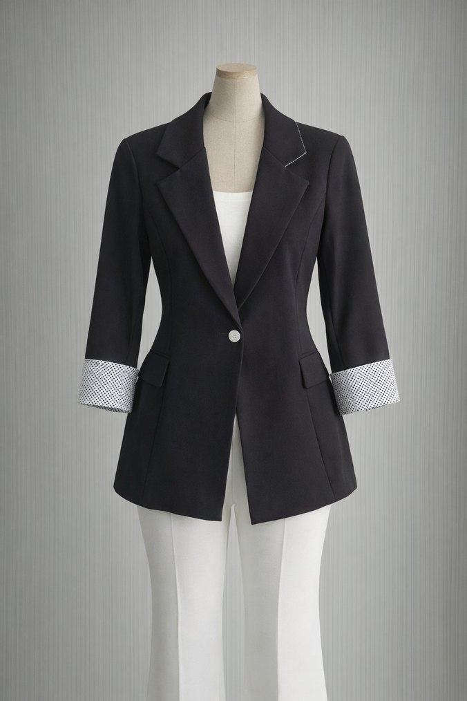 Kadınlar için notched yakalı, düğmeli, uzun kollu, beyaz desenli manşetli, sentetik kumaştan yapılmış siyah blazer ceket. Ofis kullanımı için uygundur.
