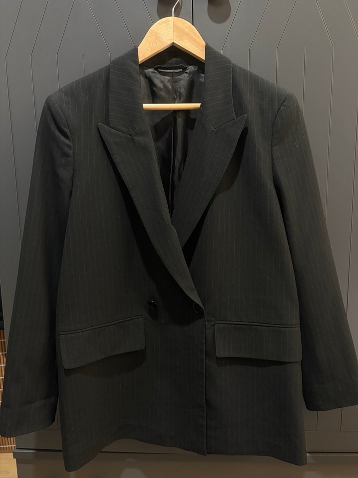 Düğmeli, siyah kadın blazer ceket, keskin yaka ve düz tasarımıyla. Sentetik kumaştan, normal uzunlukta, ofis ve günlük kullanım için uygun.ürün kullanılmamıştır