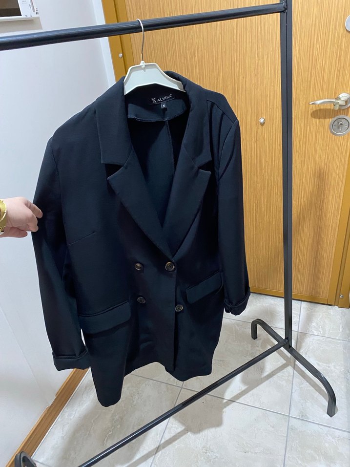 Düğmeli ön kısmı ve keskin yaka detayıyla siyah kadın blazer ceket. İpeksi dokusu ve midi boy uzunluğu ile ofis kullanımına uygundur.