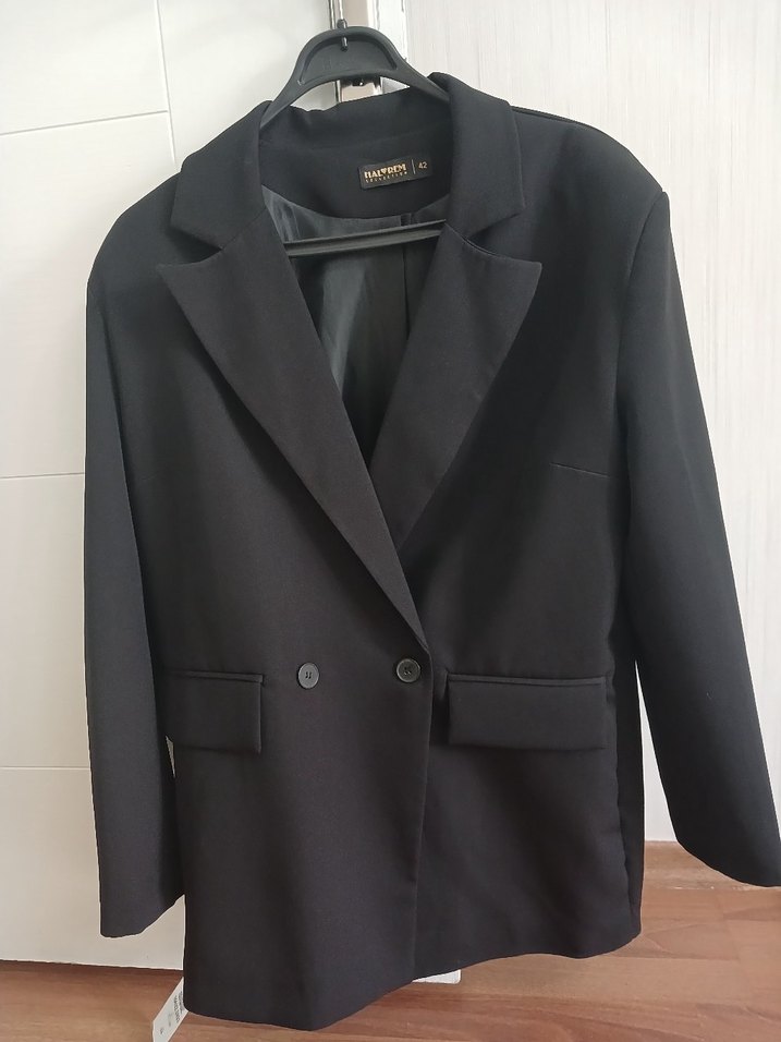Düğmeli, siyah kadın blazer ceket, normal kesim ve midi boydadır. Hiç giyilmedi. Yeni ve etiketli. İade sürecini kaçırdığım için satıyorum. 42 beden ama oversize olduğu için 44 bedenlere de olur.
