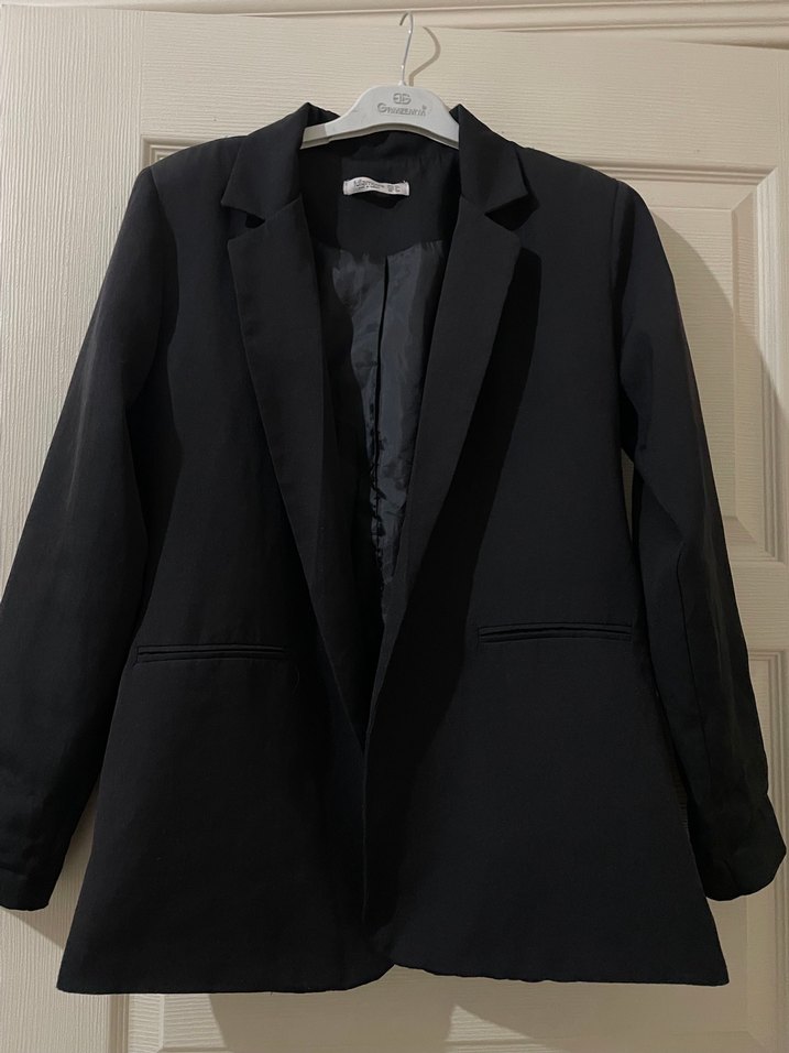 Düğmeli, siyah kadın blazer ceket; normal boy, uzun kollu ve klasik yaka detayına sahiptir. Ofis ve günlük kullanıma uygundur.