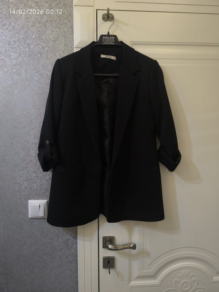 Düğmeli, siyah kadın blazer ceket; kesik yaka, uzun kollu, midi boy ve normal kesimdedir. Ofis ve sokak stiline uygundur, sentetik kumaştan yapılmıştır.