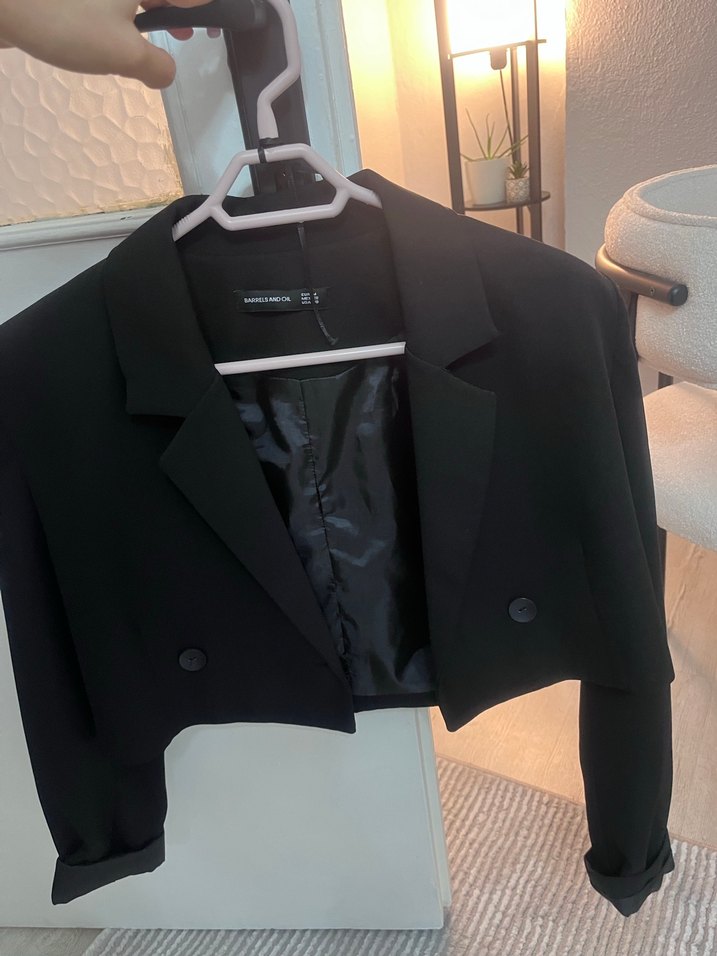 Düğmeli, uzun kollu ve kesimli siyah kadın blazer ceket. Sentetik kumaştan üretilmiş, ofis ve günlük stil için uygundur. Crop ceket