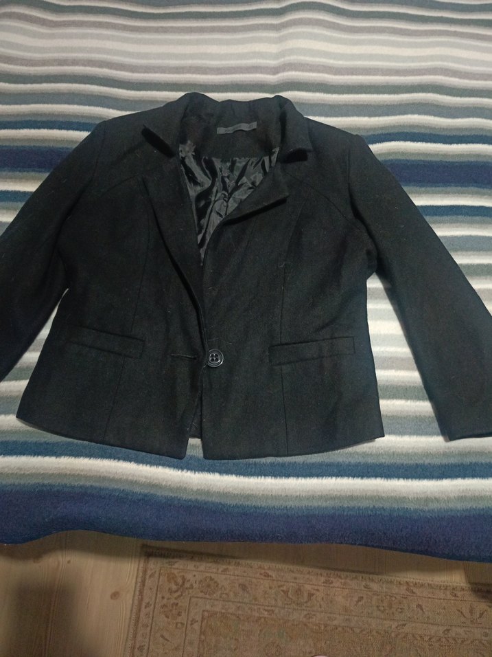 Uzun kollu, düğmeli siyah kadın blazer ceket. Normal kesim ve yaka detayına sahip, ofis kullanımı için uygun kaşe kumaştan.