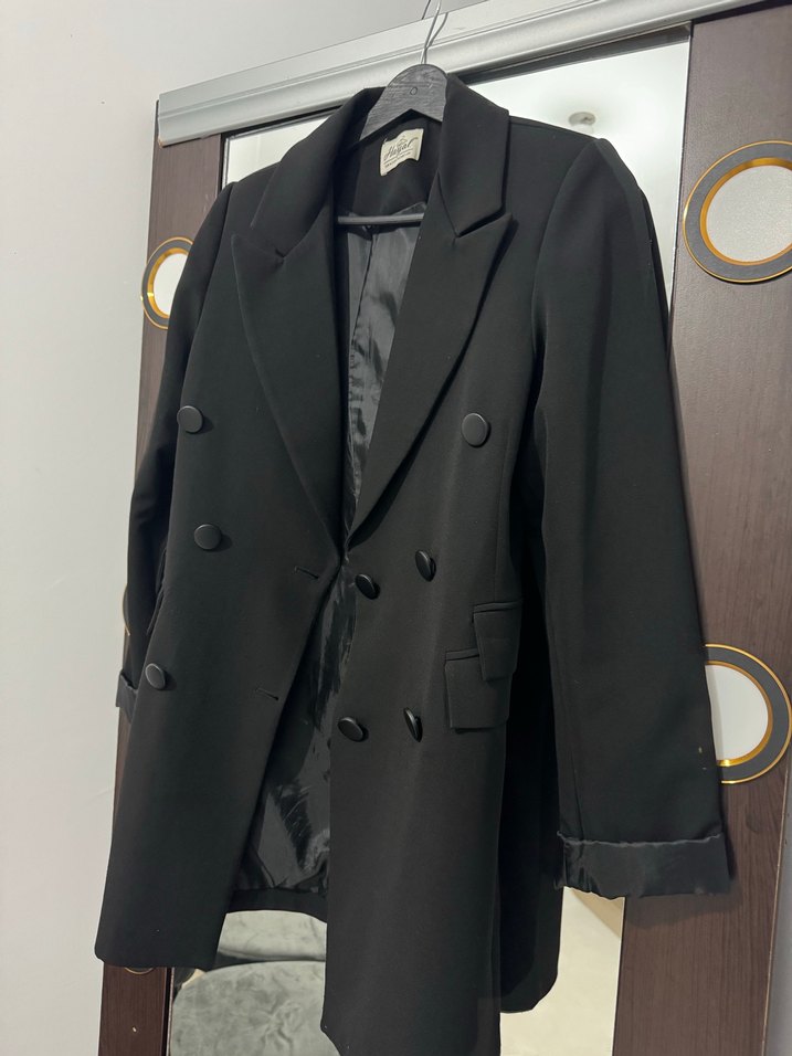 Düğmeli kapamalı, kesimli yaka detaylı siyah kadın blazer. Uzun kollu, uzun boylu ve sentetik kumaştan, klasik şıklık için ideal.