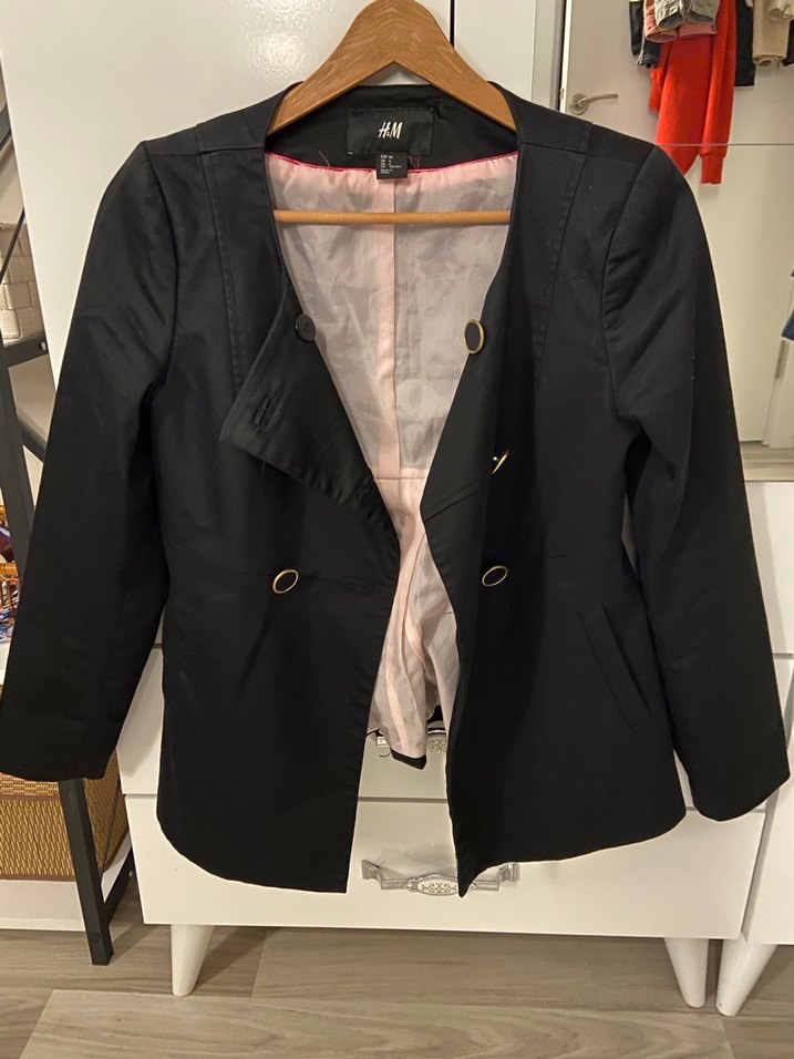 Düğmeli, normal boy, siyah kadın blazer. Notch yaka ve uzun kollu, sentetik kumaştan, iş ve sokak stiline uygun.