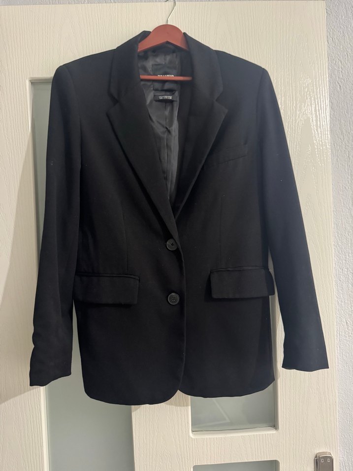 Düğmeli, siyah kadın blazer ceket, kesimli yaka ve uzun kolludur. Orta uzunlukta ve iş ortamına uygundur. Düz, desensiz ve sentetik kumaştan üretilmiştir.