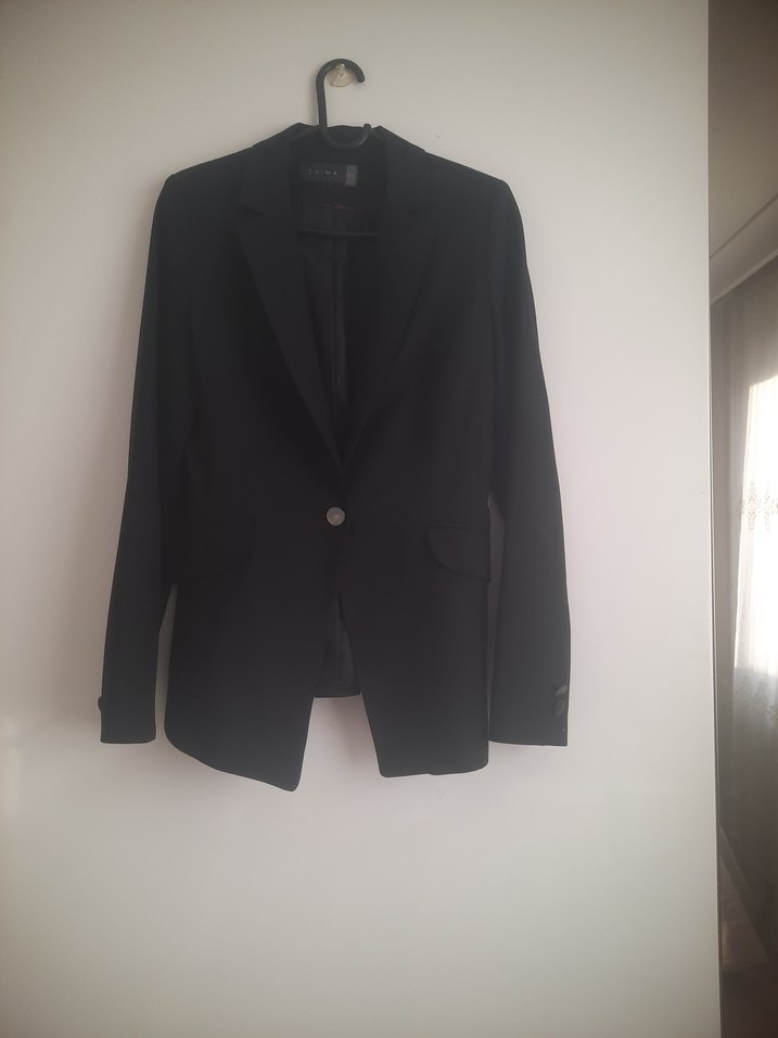 Düğmeli, siyah kadın blazer ceket, yaka detaylı ve uzun kolludur. Ofis için uygun, klasik ve zarif bir görünüme sahiptir.