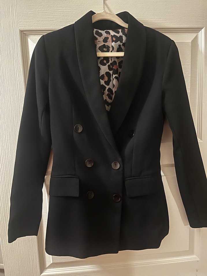 Siyah kadın blazer ceket, düğmeli ve kesimli yakaya sahip. Uzun kollu ve normal midi boyda, sentetik kumaştan üretilmiştir. Az giyildi, temiz kullanıldı. Kusuru yok.