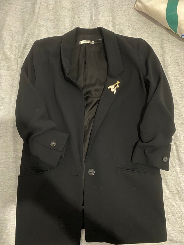 Siyah renkli, düğmeli, notched lapel yakalı, uzun kollu, midi boyda kadın blazer ceket. İpek gibi dokulu, ofis ve sokak stiline uygun şık bir parça.