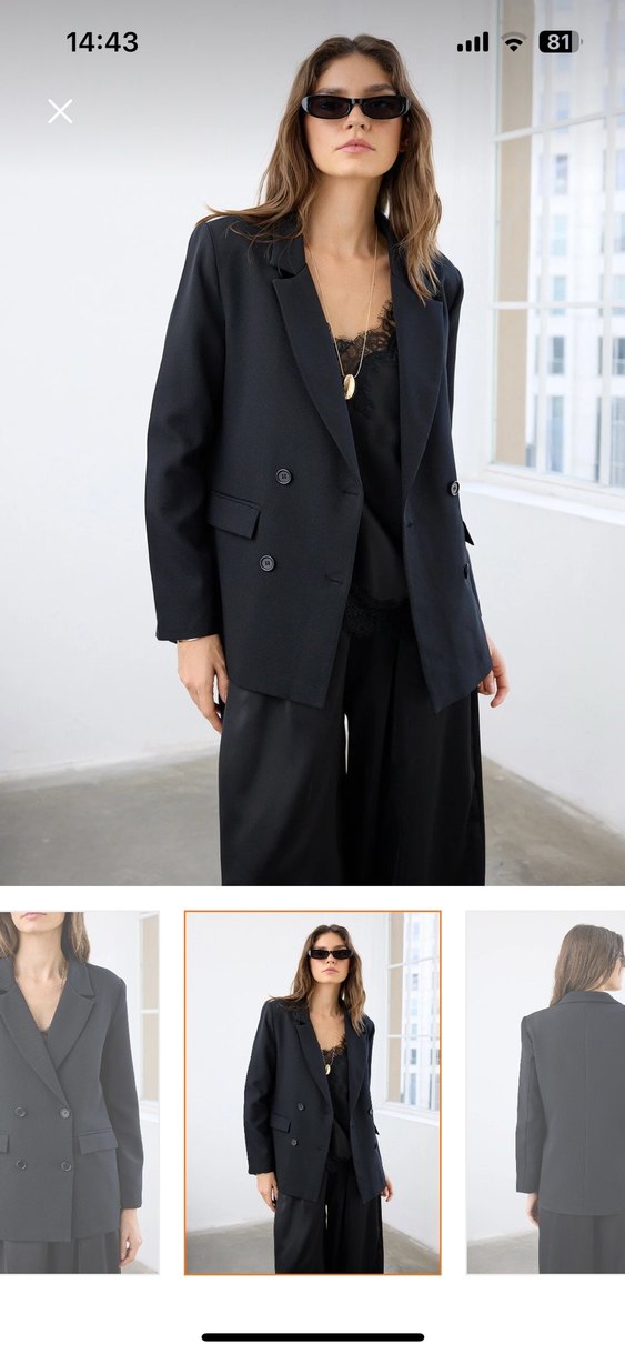 Düğmeli, siyah kadın blazer ceket, ipeksi kumaştan, klasik kesim ve normal boyda, ofis için uygundur. Hiç bir sorunu yok.