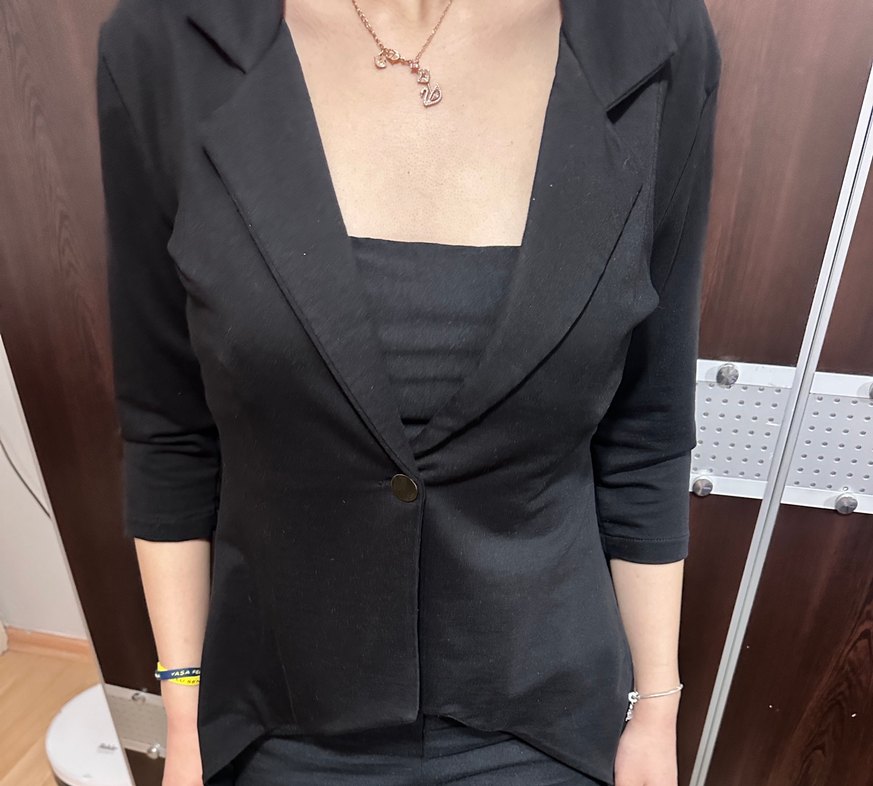 Düğmeli, yakalı siyah kadın blazer ceket. Normal uzunlukta, regular fit ve satenimsi dokuda, ofis için uygun.