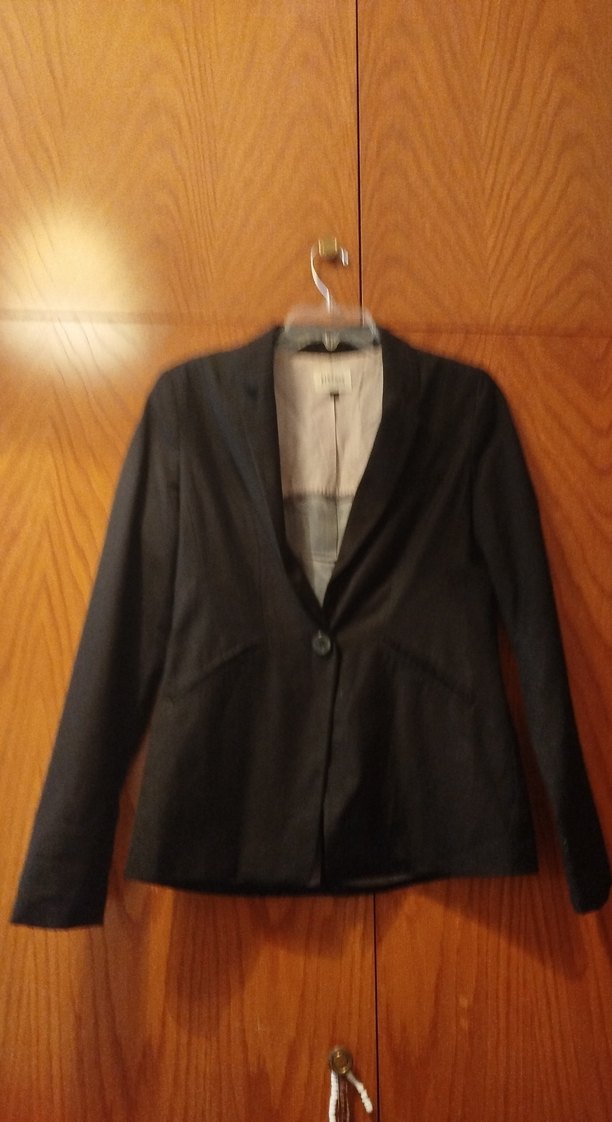 Düğmeli, siyah kadın blazer ceket, kesik yaka ve uzun kolludur. Normal kesim ve ipeksi kumaş ile ofis kullanımı için uygundur.