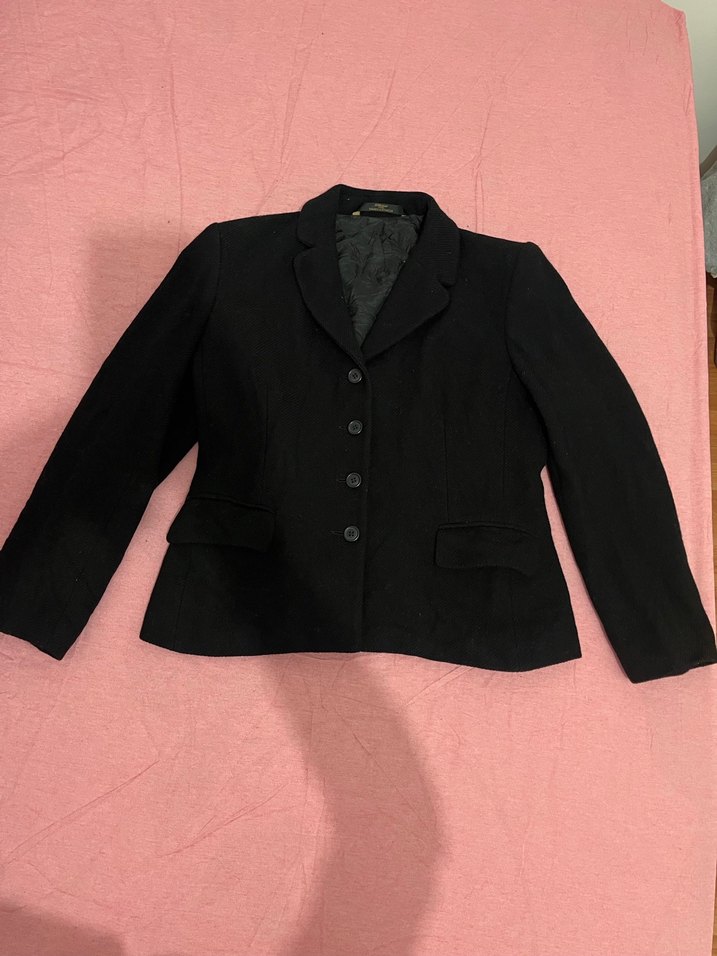 Düğmeli, siyah kadın blazer ceket, yün kumaştan. Notch yaka, uzun kollu, midi boy ve klasik goth tarzında, ofis için uygun.